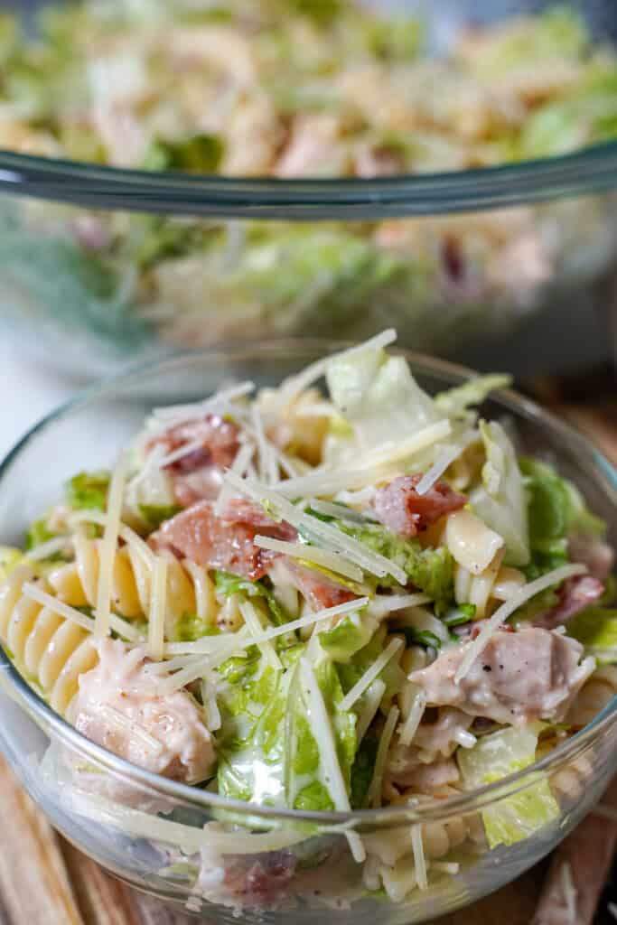 - Drain the pasta and set it aside so that it can cool. In a large bowl, combine the cooked and cooled pasta, chicken, bacon, and romaine lettuce.